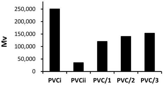 The intrinsic viscosity () of a polymeric solution can be used as a simple tool to determine the PVC average molecular weight (). The photodegradation of PVC films leads to branching and cross-linking of the polymeric chains following the elimination of HCl, and, therefore, a decrease in [55]. The PVC can be calculated using Equation (3) based on constants α and K [56],