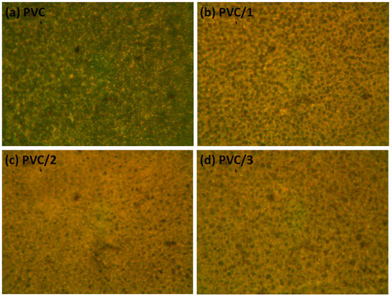 Optical microscopy provides evidence about the roughness and irregularity of the surface of a polymer film. In addition, it reveals defects, cracks, damage, decomposition, chain scission, and other changes that might occur within the polymer surface when irradiated with a UV light [20]. Such undesirable changes can be attributed to the dehydrochlorination process [57]. The surface morphology images (400× magnification) of the PVC films (Figure 11) after 300 h of continuous irradiation showed discoloration, rough surfaces, grooves, cracks, and white spots within the surface. However, the surface irregularities within the PVC films containing Sn(IV) complexes 1–3 were less noticeable than those appearing within the surface of the blank PVC film. This observation suggests that these complexes can reduce the rate of the dehydrochlorination process and therefore enhance the photostability of the irradiated PVC films.