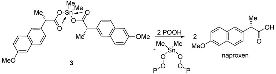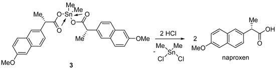 We have previously shown that various aromatic-rich Sn(IV) complexes can be used as PVC photostabilizers [31,32,33]. In addition, such complexes can be used as carbon dioxide storage media owing to their high surface areas [34]. As a continuation of our work in the field of polymers [35,36,37,38,39,40,41], new Sn(IV) complexes containing naproxen, which is highly aromatic, were synthesized and their use as efficient photostabilizers to enhance the stability of PVC against UV irradiation were investigated. The addition of a low concentration (0.5 wt %) of these new Sn(IV) complexes to PVC films increased the photostability against long-term UV irradiation significantly.