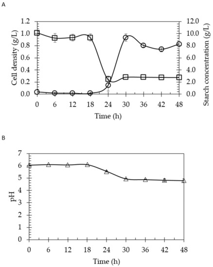 Profiling of Clostridium beijerinckii SR1 in 10 g/L of commercial starch. (A) The cell density (○) and commercial starch consumption (□) as a function of time. (B) pH changes.