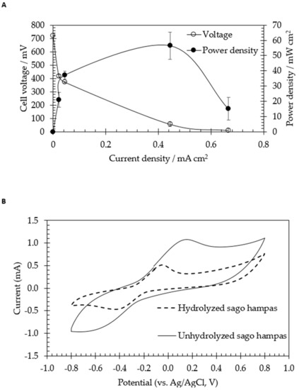 Generation from sago hampas hydrolysate by Clostridium beijerinckii SR1. (A) Power density and cell voltage generated from 10 g/L of glucose content in sago hampas hydrolysate as a function of current density. (B) Cyclic voltammetry profile of Clostridium beijerinckii SR1 recorded at 96 h after the start of anaerobic fermentation using unhydrolyzed and hydrolyzed sago hampas as substrate. The scan rate was 10 mV/s.