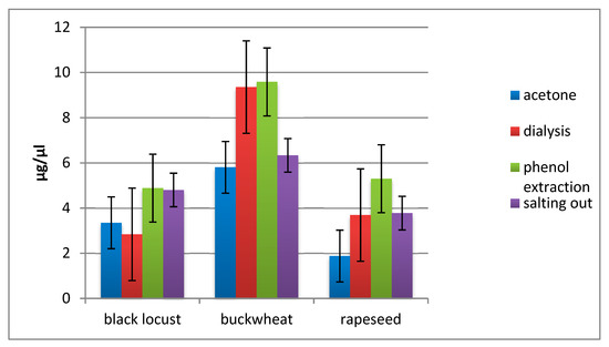 Protein concentration in extracted samples of three Polish honey types after applying four methods of isolation. Measurement performed with the use of 2D Quant Kit in two technical repeats for each of three biological repeats.