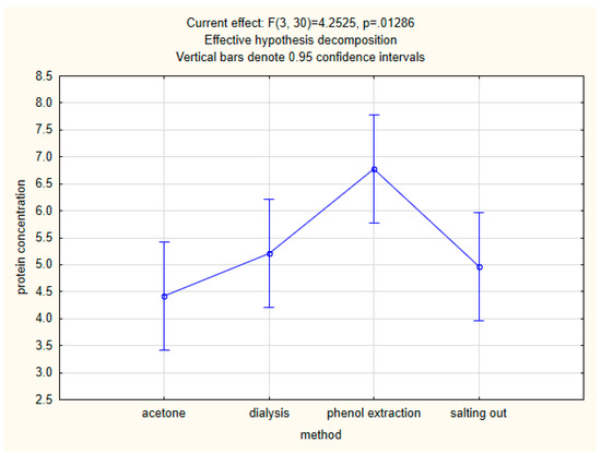 After a one-way analysis of variance, the statistical significance of differences between mean protein concentrations was confirmed. After the post-hoc test, we can conclude that in the case of the method only the phenolic method shows significant differences from the others (Figure 2).