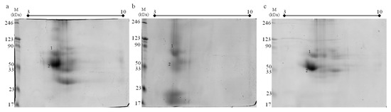 Gels obtained after 2D-PAGE electrophoresis of the: (a) black locust honey, (b) buckwheat honey, (c) rapeseed honey; 160 µg of protein obtained from phenol extraction were loaded on each pH 3–10 IPG strip; M—protein molecular mass marker Roti®-Mark PRESTAINED; 1-2—proteins identified using MS, numbers correspond with Table 2.