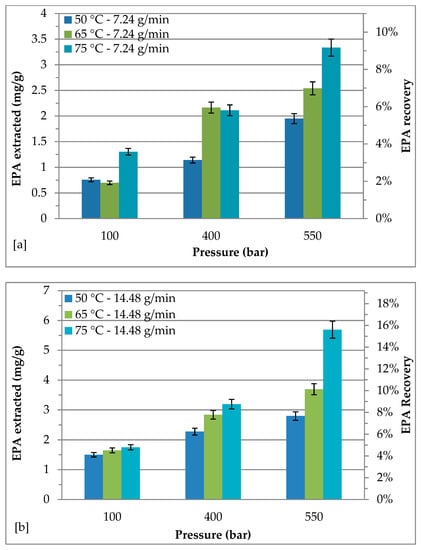 2.3. Effect of Different Pressure and Temperature on EPA Recovery with a CO2 Flow Rate of 7.24 and 14.48 g/min