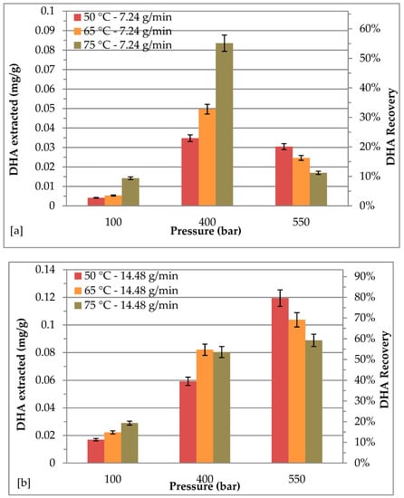 2.4. Effect of Different Pressure and Temperature on DHA Recovery with a CO2 Flow Rate of 7.24 and 14.48 g/min