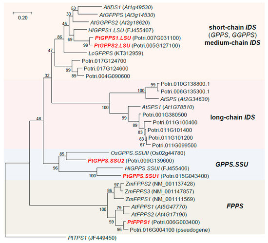 To identify putative P. trichocarpa trans-IDS genes, a thorough search of the Phytozome database (http://www.phytozome.net/poplar) was conducted using the amino acid sequences of AtFPPS1 (At5G47770), AtSPS1 (At1G78510), and AtGGPPS2 (At2g18620) from Arabidopsis thaliana and HlGPPS.SSUI (FJ455406) from Humulus lupulus as an input for BLASTP analyses. One of the resulting sequences was tentatively annotated as FPP synthase (PtFPPS1 (Potri.006g003400)) and four sequences were tentatively annotated as large and small subunits of GPP synthases (PtGPPS1.LSU (Potri.007g031100), PtGPPS2.LSU (Potri.005g127100), PtGPPS.SSU1 (Potri.015g043400), and PtGPPS.SSU2 (Potri.009g139600)).