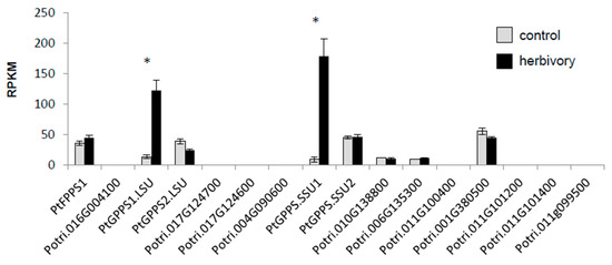 The analysis of RNAseq data obtained from gypsy moth larvae-damaged and undamaged P. trichocarpa leaves [27] revealed that transcript accumulation of PtGPPS1.LSU and PtGPPS.SSU1 was significantly increased in herbivore-damaged leaves in comparison to undamaged control leaves (Figure 2). The expression of PtFPPS1, PtGPPS2.LSU, and PtGPPS.SSU2, however, was not influenced by the herbivory treatment. Three of the putative long-chain IDS genes, Potri.010g138800, Potri.006g135300, and Potri.001g380500, also showed no changes in transcript accumulation upon herbivory, while the remaining IDS genes including the putative FPPS pseudogene Potri.016g004100 were not or nearly not expressed in this organ (Figure 2).