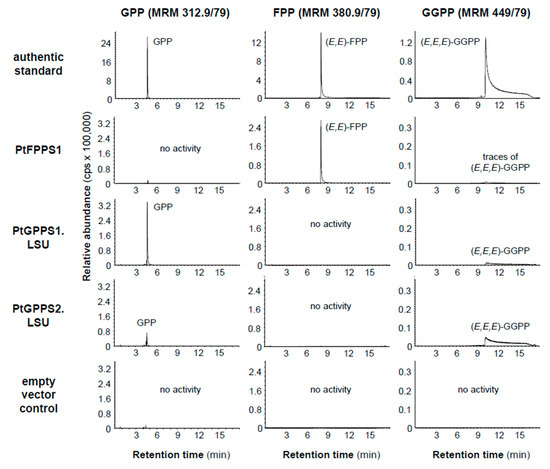 IDS activity of PtFPPS1, PtGPPS1.LSU, and PtGPPS2.LSU. The genes were heterologously expressed in Escherichia coli and purified recombinant proteins were incubated with the substrates IPP and DMAPP. Products were analyzed using LC-MS/MS and identified with authentic standards. The empty expression vector was expressed under the same conditions, assayed with IPP and DMAPP, and used as negative control.