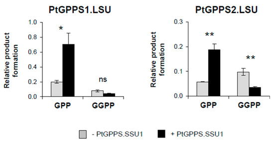 It has been reported that small subunits of heterodimeric GPPS complexes can influence the activity and product specificity of the large GPPS subunits [14,16]. Thus, we tested the effect of PtGPPS.SSU1 and PtGPPS.SSU2 on the catalytic activity of PtGPPS1.LSU and PtGPPS2.LSU. Assays containing equal amounts of purified recombinant PtGPPS1.LSU and PtGPPS.SSU1 showed higher GPPS activity and lower GGPPS activity in comparison to assays containing only the large subunit PtGPPS1.LSU (Figure 4). The product specificity of PtGPPS2.LSU was also influenced by PtGPPS.SSU1. While PtGPPS2.LSU produced GGPP as main product when assayed alone, the chain-length specificity was significantly shifted towards increased GPPS activity by PtGPPS.SSU1 (Figure 4). PtGPPS.SSU2, however, did not influence the activity or chain-length specificity of PtGPPS1.LSU and PtGPPS2.LSU in our in vitro assays (Figure S5).