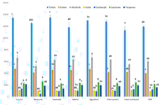 With respect to the different chemical families, the sum of alcohols, main responsible of fermentative aroma, showed no differences with control wine when PGP was applied. For the rest of the fining agents applied, only the use of bentonite decreased the content of total alcohols. Armada et al. [22] using bentonite in Albariño wines found a reduction of the concentration of these compounds by 33%. Furthermore, Salazar et al. [23] reported a diminution in major alcohols when bentonite was added at the end of alcoholic fermentation.