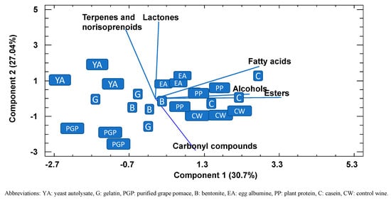 A PPC analysis, a powerful visualization tool that enables groupings to be observed within data, was conducted to check whether the wines could be separated according to the variables studied and, if so, to identify which were mainly responsible for any grouping found (Figure 2). The first two principal components explained 58% of the variance, and representation of these two principal components showed that all the replications of control wines together with plant protein and casein had lower values in component 1 than PGP, yeast autolysate, bentonite, and gelatin, mainly due to lower values of alcohols, fatty acids, and esters. Along component 2, PGP can be differentiated from the other fining agents on the basis of terpenes, norisoprenoids, and lactones. The results of this analysis confirmed the previous observation that PGP retained part of the volatile aroma compounds to a greater extent than fining agents, such as plant protein or casein, but similar to other common fining agents, such as yeast autolysates or bentonite.