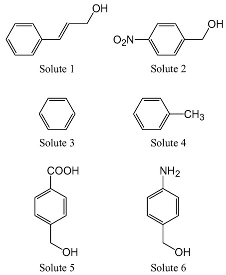 By evaluating the selectivity of various stationary phases in SFC, we attempted to elucidate the relevant chromatographic properties. The structures of the solutes used are shown in Figure 4. As in Figure 2, the structures were drawn to summarize the properties of the solutes used for the evaluation of HPLC. Based on these properties, we selected samples suitable for SFC evaluation. For example, benzyl alcohol with hydroxyl groups was used as the reference substance to obtain appropriate retention factors. The chromatographic properties (hydrophobic, hydrophilic, π-π, and dispersion interactions) for 18 stationary phases (Figure 1) were listed in Table 4.