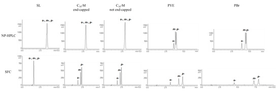 An excellent example showing the difference between NP-HPLC and SFC can be observed in the chromatograms of terphenyl isomers (o-, m-, p-), which are π electron-rich and non-polar compounds (Figure 3). In NP-HPLC, SL and C18 showed little retention of these compounds, whereas PYE and PBr retained the solutes slightly but with insufficient separation. In contrast, SFC with SL yielded the same result, but C18 retained the solute, achieving separation. In addition, the retention factors of PYE and PBr were increased and the solutes were sufficiently separated. These results are in agreement with the behavior shown in Table 1 and Table 2 and support the hypothesis that secondary interactions are enhanced in SFC compared to those in HPLC.