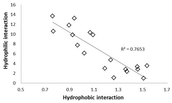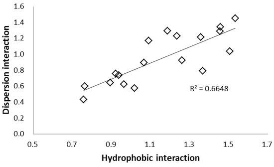 The dispersion interaction was evaluated using a different separation factor k Solute 12/k Solute 8 (α –OCH2CH-). Dispersion force generally increases with molecular size and was evaluated using solutes of similar polarity but different sizes (solutes 12 and 8). Stationary phases with polycyclic aromatic rings and heavy atoms, such as PYE, PBr and naphthylethyl (NAP) phases showed large values. On the other hand, stationary phases with monocyclic aromatic rings, such as HP, PY, and EP phases showed lower values and did not contribute significantly to dispersion interactions [46,50]. In Figure 6, the hydrophobic interaction was plotted against the dispersion interaction, and a positive correlation was obtained.