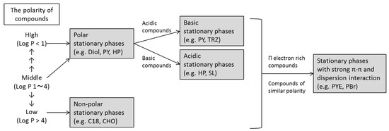 From the above results, it is possible to predict a suitable column for a particular solute from the stationary phase structure. The suggested guidelines for column selection developed from the results of this study are shown in Figure 7. In creating the guideline, retention factor was more important than selectivity because, even when exhibiting high selectivity, similar compounds cannot be separated if retention is poor. If a compound has medium to high polarity (log P ˂ 4), a polar stationary phase would yield high retention, whereas compounds with low polarity (log P ˃ 4) would be better retained by a non-polar stationary phase. In contrast, if retention is excessively long resulting in elution complications, a stationary phase with a contrasting polarity could be used to decrease the retention time. In addition, by utilizing π-π and dispersion interactions, it is possible to achieve good separation in SFC for compounds that cannot be separated via HPLC.