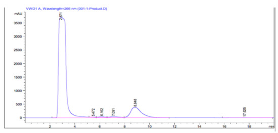 Using the thin layer chromatography method, it was confirmed that the reaction product contains a new compound indicated by a new spot appearing on the thin layer chromatography plate at Rf 0.88. This product was compared with the reactant of the products. Meanwhile, methyl linoleate and pyrogallol have different Rf value with the product (Figure 3). This result was suitable given the fact that the product was more non-polar compared to the reactants based on the log P value from ChemDraw Professional 16.0 software. The value of log P or partition coefficient was used as a reference to determine the compound’s relative polarity [20]. The mixture was later subjected to HPLC for the quantitative analysis at its optimum wavelength of 266 as shown in Figure 4.