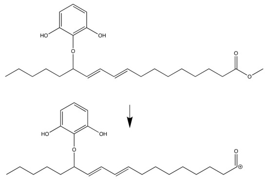 Fragmentation for methyl (9E,11E)-13-(2,6-dihydroxyphenoxy)octadeca-9,11-dienoate.