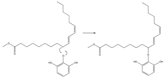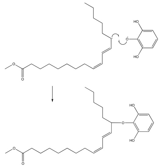 Radical termination mechanism of pyrogallol and methyl linoleate to form methyl (10E,12E)-9-(2,6-dihydroxyphenoxy)octadeca-10,12-dienoate.