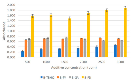 The solubility limit of pyrogallol (PY), tert-butylhydroquinone (TBHQ) and gallic acid (GA) were compared with the pyrogallol derivative (PD) in biodiesel solution. An ultraviolet–visible (UV–VIS) spectrophotometer was used for the analysis. Biodiesel without antioxidants (B) was subjected to the UV-VIS spectrophotometer to obtain its wavelength versus absorbance graph to find the optimum wavelength (gallic acid 246 nm, pyrogallol 298 nm, TBHQ 268 nm, pyrogallol derivative 246 nm). The same procedure was done with different biodiesel additive mixtures: biodiesel-pyrogallol (B-PY), biodiesel-TBHQ (B-TBHQ), biodiesel-gallic acid (B-GA), and biodiesel-pyrogallol derivative (B-PD). The absorbance of biodiesel-additive mixtures at six increasing concentrations, 500 ppm, 1000 ppm, 1500 ppm, 2000 ppm, 2500 ppm, and 3000 ppm, was read at their specific maximum wavelength. The solubility limit was reached when the absorbance of the solution stop increased or remained constant with the increasing concentration. These solubility limits were used as a concentration of the additive to be added in biodiesel for the antioxidant activity test. Two-way factor analysis of variance (ANOVA) was used for the statistical analysis using SPSS software.
