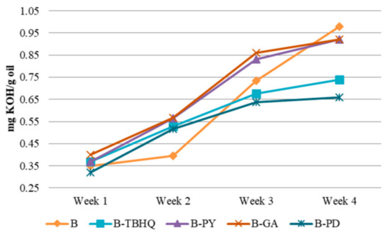 After the addition of antioxidants, viscosity of samples increased over the storage period. Comparing the slope jump of the samples, B holds the highest slope of viscosity increase (0.4609), followed by B-PD (0.3873), B-GA (0.3009), B-TBHQ (0.2434) and B-PY (0.2624). Therefore, B-PY is the most effective in slowing down the viscosity increase over time, with B-TBHQ, B-GA and B-PD following. From this result, whilst B-PD does not show the best performance, its antioxidant activity in preventing the formation of polymer product is constantly shown by the fact that it has a lower viscosity jump slope compared to biodiesel without additive. However, although PD was found to be less effective compared to other pure phenolic antioxidants in holding the viscosity value as a marker of secondary oxidation products, its superiority over other antioxidant is proven from the acid number analysis as explained in Section 2.2.2. Understanding that primary oxidation is more likely to happen than secondary oxidation, it is more important to avoid primary oxidation from happening, and PD has been proven to be reliable for this purpose. Therefore, PD can still be considered to have high antioxidant potential.