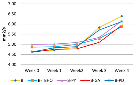 Viscosity is a marker of secondary oxidation of biodiesel as a result of polymeric species which are formed by linking fatty acid/FAME chains [21]. The result of the viscosity experiment during four weeks of storage is shown in Figure 15.