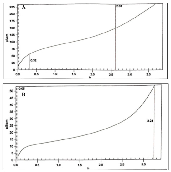 The biodiesel oxidation stability test was performed by using a Metrohm 873 Biodiesel Rancimat instrument in accordance to the standard test method EN 14112 [21,34,35]. This method accelerates the aging process of the biodiesel sample in the presence of heat of 110 °C and a continues air flow with the rate of 10 L/h. In this condition, biodiesel was oxidizes producing volatile, water-soluble oxidation products such as short chain carboxylic acid like formic acid. This event is detected by the increasing of biodiesel’s conductivity. The equipment measures the time required (h) until the oxidation occurs at the high rate or also known as induction time/induction period (IP).