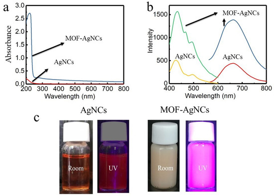 (a) UV-Vis, (b) fluorescence excitation (left), emission (right); (c) the corresponding photographs of AgNCs, and MOF-AgNCs at room and 365 nm UV light.