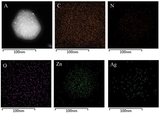 TEM images of MOF-AgNCs (A), and the corresponding elemental mappings for the nanocomposite (the element was marked on the images).