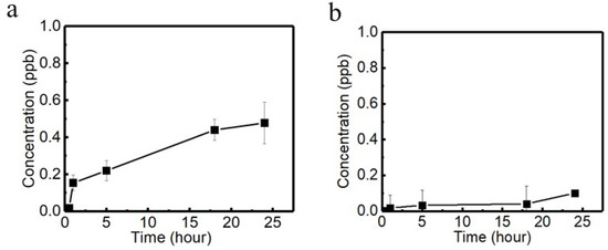 Normally, relatively low concentrations of Pb2+ and Mn2+ are present in natural water. The tap water was spiked with Pb2+ and Mn2+. After adding absorbents (MOF-AgNCs), the concentrations of the metal ions in the supernatants were measured (Figure 7). For Mn2+, the concentration was dropped from 100 ppb to lower than 20 ppb after half an hour. The MOF-AgNCs didn’t improve the removal efficiency significantly compared to ZIF-8. On the other hand, the concentration was reduced to less than 1 ppb quite fast for Pb2+ by MOF-AgNCs. Normally, it is difficult to reduce Pb2+ to trace level [19,20]. This indicates that the composite is quite promising to purify Pb2+ efficiently in aqueous system.