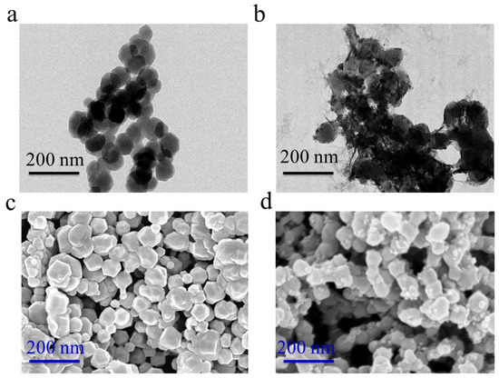TEM (a,b), SEM characterizations (c,d) for MOF-AgNCs (a,c) and the products after the treatment of Mn2+ and Pb2+ (b,d).