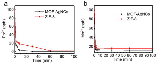 The removal of Pb2+ (a) and Mn2+ (b) in the presence of MOF-AgNCs and ZIF-8 as a function of time.