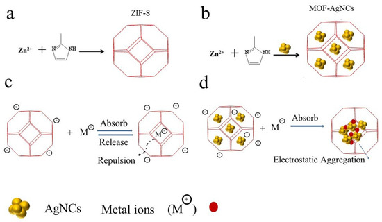 Schematic of the formation of ZIF-8 (a); encapsulation of AgNCs in metal-organic frameworks (b); the absorption of Mn2+ and Pb2+ by ZIF-8 (c) and MOF-AgNCs (d).