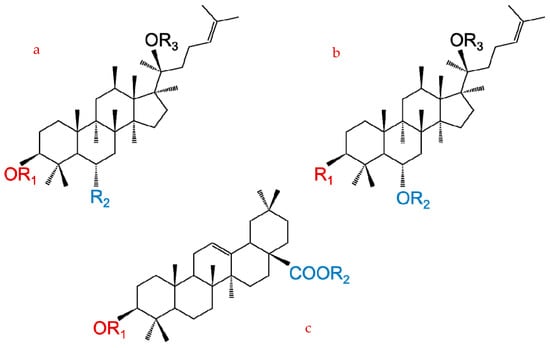 Chemical structures of three ginseng saponin types: (a) protopanaxadiol type (PPD); (b) protopanaxatriol type (PPT); and (c) oleanolic acid type.