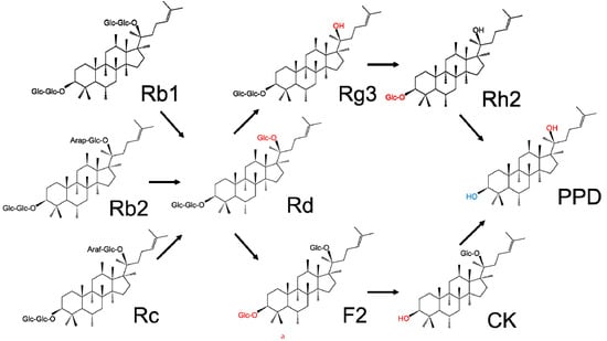 However, ginseng saponins are not easily absorbed by the body through the intestines because of their hydrophilicity, although a small amount can be absorbed in the gastrointestinal tract after orally administration. Reports suggest that the intestinal flora can degrade saponins into secondary glycosides or aglycones through hydrolysis of the glycosidic bonds and regulate their pharmacokinetics after oral intake, which in turn further determines their pharmacological efficacies [12]. As shown in Figure 2, upon their oral consumption, ginseng saponins are partly transformed into PPD and PPT through a series of deglycosylation procedures via acid hydrolysis and intestinal bacterial actions [13]. All the metabolites, such as compound K (CK), are nonpolar compared to the parental components, which can easily be absorbed in the gastrointestinal tract and express biological actions.