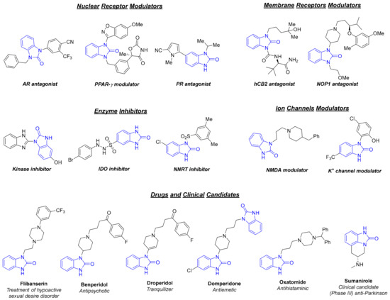 Examples of benzimidazolone-based biologically active derivatives, drugs, and clinical candidates.