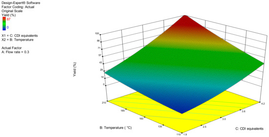 Thus, the data acquired (Supplementary Materials and Table 2) were fitted into a linear equation defining a mathematical model (Equation (1)). The analysis of variance (ANOVA) of the model indicated that all the terms were significant (p-value < 0.05) (Table 3). Furthermore, the signal-to-noise ratio (adequate precision) and lack of fit were adequate to explore the chemical space, while the statistical and prediction parameters (R2, adjusted R2 and predicted R2) fell within acceptable limits (Table 3). Thus, a three-dimensional response surface was generated according to the mathematical model confirming our hypothesis on the dependence of the measured response (% yield of 1) on total flow rate (A), temperature (B), and CDI stoichiometry (C) (Figure 3). The DoE software was provided with optimisation criteria based upon the maximisation, minimisation, or evaluation in the explored range of each factor and response, fixing a desirability limit within the optimised conditions. The software furnished different solutions ranked in desirability order, among which the suitable conditions exhibited the highest desirability index. Notably, a high degree of correlation between the predicted and the experimental yield was observed with a total flow rate of 0.3 mL min−1 (which corresponds to 33 min of residence time), at a temperature of 210 °C, and in the presence of 4.2 equiv. of CDI, allowing obtaining 1 in 98% yield (Supplementary Materials and Table 4).