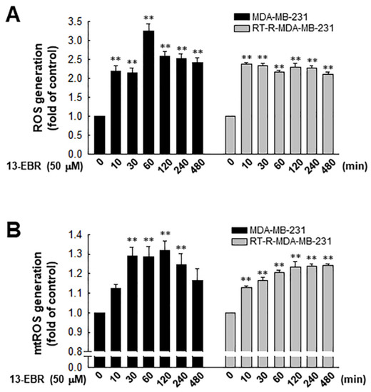 It was reported that excessive ROS can induce apoptosis through both the extrinsic and intrinsic pathways [19]. Furthermore, excessive mitochondrial oxidant stress can induce cell death in tumor cells [20]. Thus, we examined the effects of 13-EBR on the production of intracellular total ROS, including mitochondrial ROS, in RT-R MDA-MB-231 and MDA-MB-231 cells. When both of the breast cancer cell lines were treated with 50 µM 13-EBR, the treatment significantly enhanced the intracellular total ROS and mitochondrial ROS production from early time points compared to the controls (Figure 2).