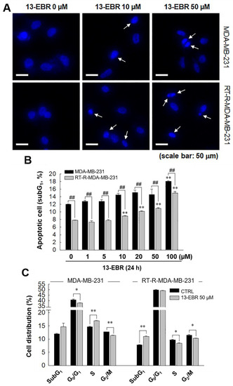 Induction of apoptotic cell death in MDA-MB-231 and RT-R MDA-MB-231 cells with 13-EBR through the intrinsic pathway. (A) Both cell lines were seeded on a cover slip that was mounted onto a self-designed perfusion chamber and then stimulated with 13-EBR at the indicated doses for 24 h. The fragmented DNA was observed, as described in Section 4. White arrows represent the fragmented DNA. (B) Both breast cancer cell lines were treated with 13-EBR at the indicated doses for 24 h, and then apoptotic cells were identified by analyzing the sub-gap 1 (subG1) phase using a fluorescence-activated cell sorting (FACS) system, as described in Section 4. (C) Both cell lines were treated or were not treated with 13-EBR at 50 µM for 24 h, and then the cell distribution in the cell cycle was determined using the FACS system. The values represent the mean ± SEM of three independent experiments; ** p < 0.01, * p < 0.05 compared to the control; ## P < 0.01 compared to the MDA-MB-231 cells.