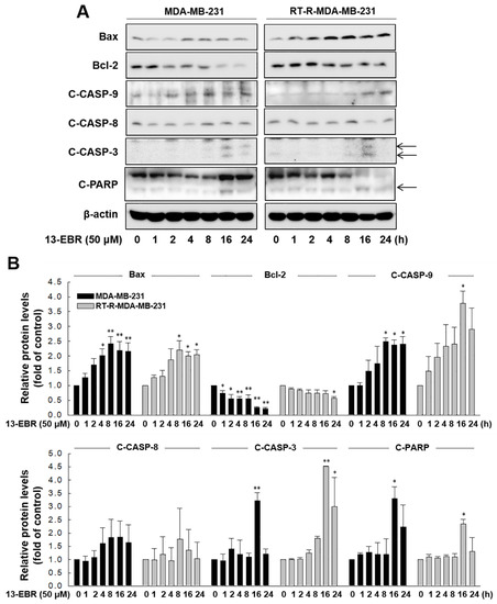 Next, we further examined whether 13-EBR induces apoptosis in both MDA-MB-231 and RT-R MDA-MB-231 cells by observing DNA shrinkage or nuclear fragmentation that occurs in cells undergoing apoptosis. As expected, 13-EBR stimulation induced DNA shrinkage at 10 μM and DNA fragmentation at 50 μM in both MDA-MB-232 and RT-R MDA-MB-231 cells (Figure 3A). Moreover, 13-EBR induced apoptosis, as shown by the increased sub-gap 1 (subG1) population in both MDA-MB-231 and RT-R MDA-MB-231 cells in a dose-dependent manner compared to that in the controls (Figure 3B). In addition to the subG1 population, the synthesis (S) and gap 2/mitosis (G2/M) populations were remarkably changed in response to 50 μM 13-EBR treatment in MDA-MB-231 and RT-R MDA-MB-231 cells compared to the controls (Figure 3C). As mentioned above, an increase in ROS can induce apoptosis through both the extrinsic and intrinsic pathways. Thus, we investigated which apoptotic signaling pathway is involved in 13-EBR-induced apoptosis in MDA-MB-231 and RT-R MDA-MB-231 cells. The protein level of Bax, a pro-apoptotic gene, in the control group of RT-R MDA-MB-231 was little lower than that in the control of MDA-MB-231, as presented in Table 1, and 13-EBR stimulation significantly increased the protein level of Bax in both cell lines. However, 13-EBR decreased the level of Bcl-2, an anti-apoptotic gene, in a time-dependent manner compared to that in the controls in both cell lines. Moreover, the protein levels of cleaved caspase-9, -3, and poly(ADP ribose) polymerase (PARP) were also increased in response to 13-EBR treatment compared to the controls. However, 13-EBR did not affect the cleaved caspase-8 protein levels (Figure 4A,B). These results suggested that 13-EBR induces apoptotic cell death via the regulation of the mitochondria-related intrinsic pathway rather than an extrinsic pathway in MDA-MB-231 and RT-R MDA-MB-231 cells.