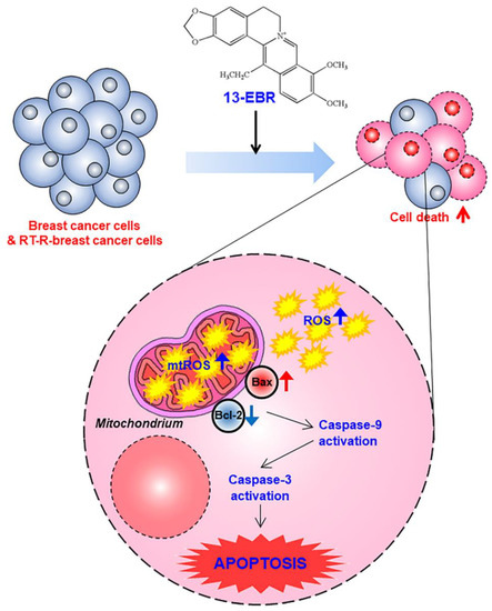 Taken together, we demonstrated that 13-EBR has antiproliferative and pro-apoptotic effects in both TNBC and RT-R TNBC cells through the induction of intracellular ROS production and the mitochondria-mediated apoptosis pathway (Figure 5). Although the effects of 13-EBR were not specific to RT-R breast cancer cells, it is meaningful that 13-EBR could suppress cell proliferation and colony formation and could induce cellular apoptosis in RT-R MDA-MB-231 cells, which had higher colony-forming abilities and showed lower expression of pro-apoptotic genes and higher expression of anti-apoptotic genes than MDA-MB-231 cells. These findings provide useful insights for the exploration of new potential therapeutic strategies for both radiotherapy-resistant breast cancer treatment and also TNBC treatment.