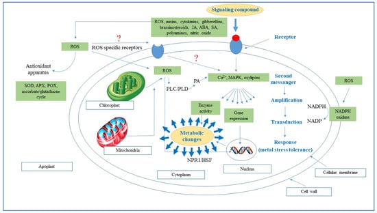 Schematization of signal transmission and transduction in plant cells. Abbreviation: ABA, abscisic acid; APX, ascorbate peroxidase; HSF, redox-sensitive transcription factor; JA, jasmonic acid; MAPK, mitogen-activated protein kinase; NADP, oxidized nicotinamide adenine dinucleotide; NADPH, reduced nicotinamide adenine dinucleotide; NPR1, redox-sensitive transcription factor; OXI1, serine/threonine kinase; PA, phosphatidic acid; PLC/PLD, phospholipases class C and D; POX, peroxidase; ROS, reactive oxygen species; SA, salicylic acid; SOD, superoxide dismutase.
