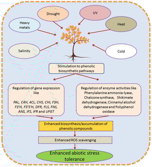 In response to abiotic stresses, biosynthesis of secondary metabolites, including polyphenols, is usually increased in plants. Phenolics confer indeed higher tolerance to plants against various stress conditions like heavy metals, salinity, drought, temperature, pesticides, and UV radiations [33,72,73,74,75,76,77]. Plants growing under stressful environments have the ability to biosynthesize more phenolic compounds in comparison to plants growing under normal conditions [78]. These compounds have antioxidative properties and are capable of scavenging free radicals, resulting in reduction of cell membrane peroxidation [79], hence protecting plant cells from ill effects of oxidative stress. Biosynthesis of phenolics under stressful environments is regulated by the altered activities of various key enzymes of phenolic biosynthetic pathways like PAL and CHS (chalcone synthase). Enhanced performance of enzymes is also accompanied by the up-regulation of the transcript levels of genes encoding key biosynthetic enzymes like PAL, C4H (cinnamate 4-hydroxylase), 4CL (4-coumarate: CoA ligase), CHS, CHI (chalcone isomerase), F3H (flavanone3-hydroxylase), F3′H (flavonoid 3′-hydroxylase), F3′5′H (flavonoid 3′5′-hydroxylase), DFR (dihydroflavonol 4-reductase), FLS (flavonol synthase), IFS (isoflavone synthase), IFR (isoflavone reductase), and UFGT (UDP flavonoid glycosyltransferase) [74,80,81,82,83,84,85,86]. The responses of phenolic compounds under different abiotic stresses have been discussed in individual sections mentioned below.