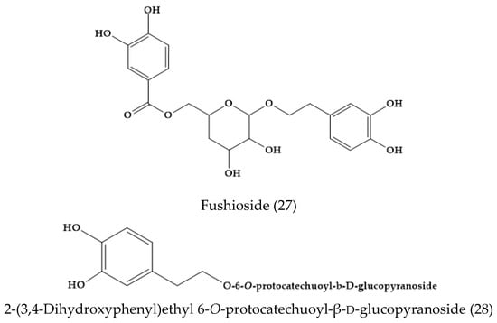 From the methanolic extract of the aerial parts of V. fuhsii, Ozipek and co-workers isolated and reported fushioside (27) and 2-(3,4-dihydroxyphenyl)ethyl 6-O-protocatechuoyl-β-d-glucopyranoside (28), along with a known phenylethanoid glycoside, plantamajoside (29), and a flavone glucoside, luteolin 7-O-glucoside (30) (Figure 5) [30]. Note that this species is endemic of Middle Anatolia [30], and it is not included in the plant list.