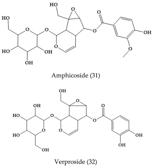 The main iridoids and iridoid-phenolic constituents of extracts from this plant were catalpol (1), amphicoside (31), and verproside (32), together with alpinoside (33), aucubin (8), 6-O-veratroylcatalpol (34), and verminoside (35) (Figure 6). The iridoid alpinoside with a 8,9-double bond was found for the first time in genus Veronica [31]. In V. cymbalaria, other authors found the iridoid glucosides aucubin (8), catalpol (1), veronicoside (20), verproside (32), amphycoside, verminoside (35), catalposide (6), 6-O-veratroylcatalposide (34), and 6-O-isovanilloylcatalpol [32].
