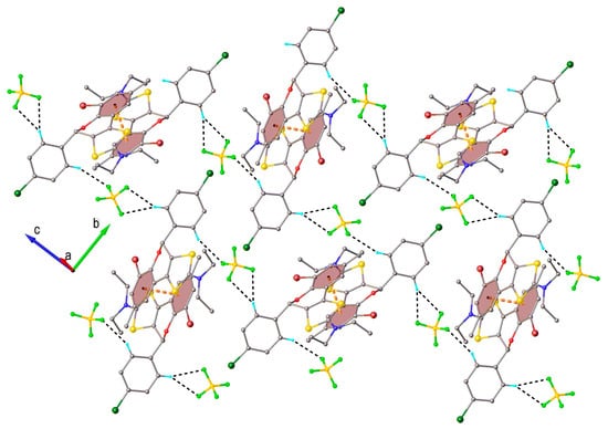 Partial view of the crystal packing viewed along a axis. H-bonds are drawn in dashed black, while centroid-to-centroid contacts are in dashed orange lines.