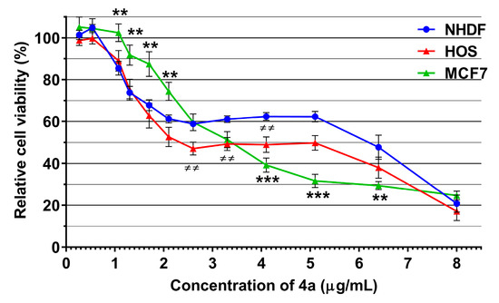 MTS assay, graphical representation of relative viability compared to untreated cells. NHDF, HOS and MCF7 cells were treated for 48 h with various concentrations of 4a. The results are presented as a mean value ± the standard error of the mean (S.E.M.), n = 13–15. * p < 0.05, ** p < 0.01, and *** p < 0.001 MCF7 vs. NHDF; ≠ p < 0.05, ≠≠ p < 0.01, and ≠≠≠ p < 0.001 HOS vs. NHDF by Student’s t-test.