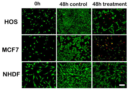 Human osteosarcoma (HOS) and MCF7 cell lines were purchased from CLS Cell Lines Service GmbH (Eppelheim, Germany) and Normal Human Dermal Fibroblasts (NHDF) cell line from PromoCell, (Heidelberg, Germany); Eagle’s Minimal Essential Medium alpha (aMEM), Dulbecco’s Modified Eagle Medium (DMEM) without phenol red, 1% Penicillin–Streptomycin–Amphotericin B mixture (10K/10K/25 µg in 100 mL) and Trypsin–Versene (EDTA) mixture from Lonza, Verviers, Begium; fetal bovine serum (FBS) from Biochrom GmbH, Germany, CellTiter 96® Aqueous One Solution Cell Proliferation Assay from Promega (Madison, WI, USA); Tryple from Gibco, (Langley, VA, USA); LIVE/DEAD Viability/Cytotoxicity Kit and phosphate buffered saline (PBS) from Invitrogen, (Eugene, OR, USA), 35-mm Cell Imaging Dishes from Eppendorf (Hamburg, Germany).