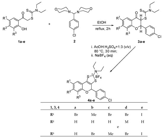 The synthetic route used to obtain 1,3-dithiolium flavonoids 4a–e is described in Scheme 1 and follows the protocol used for the model compound 4a [19].
