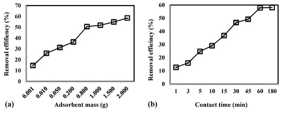 Figure 2 illustrates the parametric effects of adsorbent mass, contact time, and temperature on the removal efficiency of As(V) using CCB. Results demonstrate that increasing adsorbent mass from 0.001 to 2.0 g led to an increase in removal efficiency from 14.70% to 58.55%, respectively. A higher amount of adsorbent present in the system would imply that there is greater surface area and higher number of binding sites that are available for adsorption.